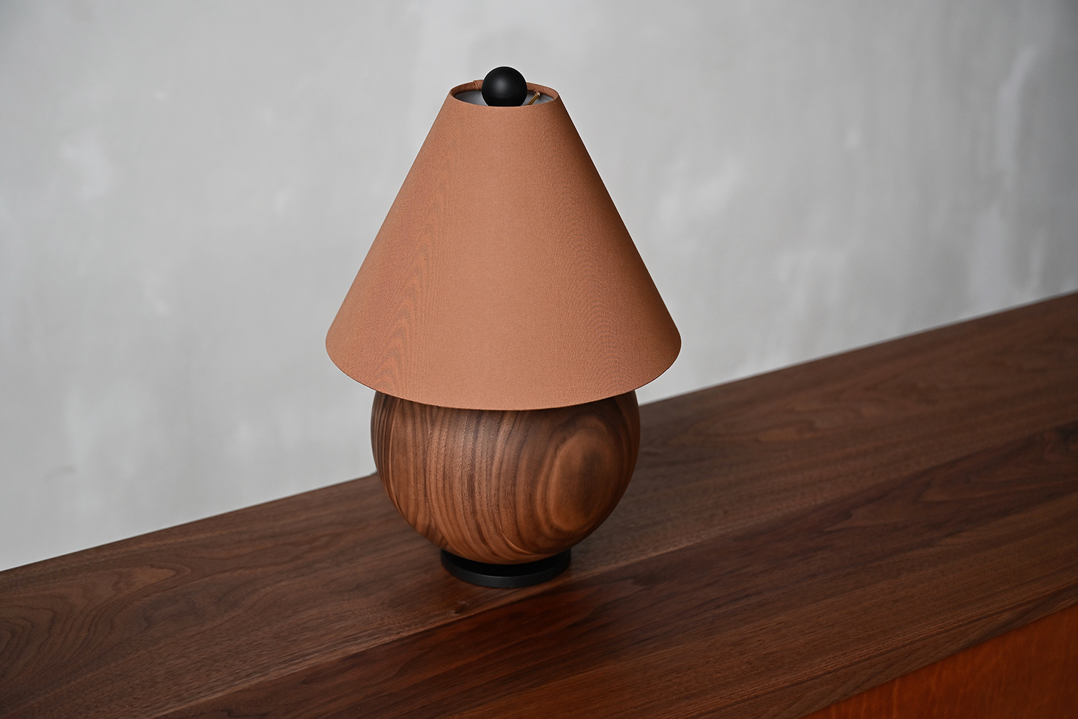 Oiled Walnut or Oiled White Oak, blackened steel metal base, and linen shade.