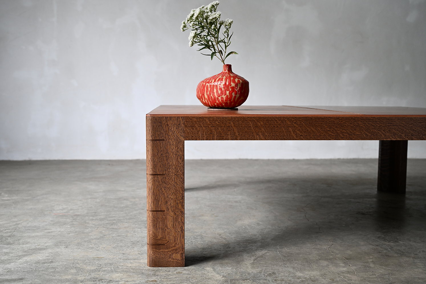 Solid wood with end-grain wood splines, leather surface, and contrast stitching.