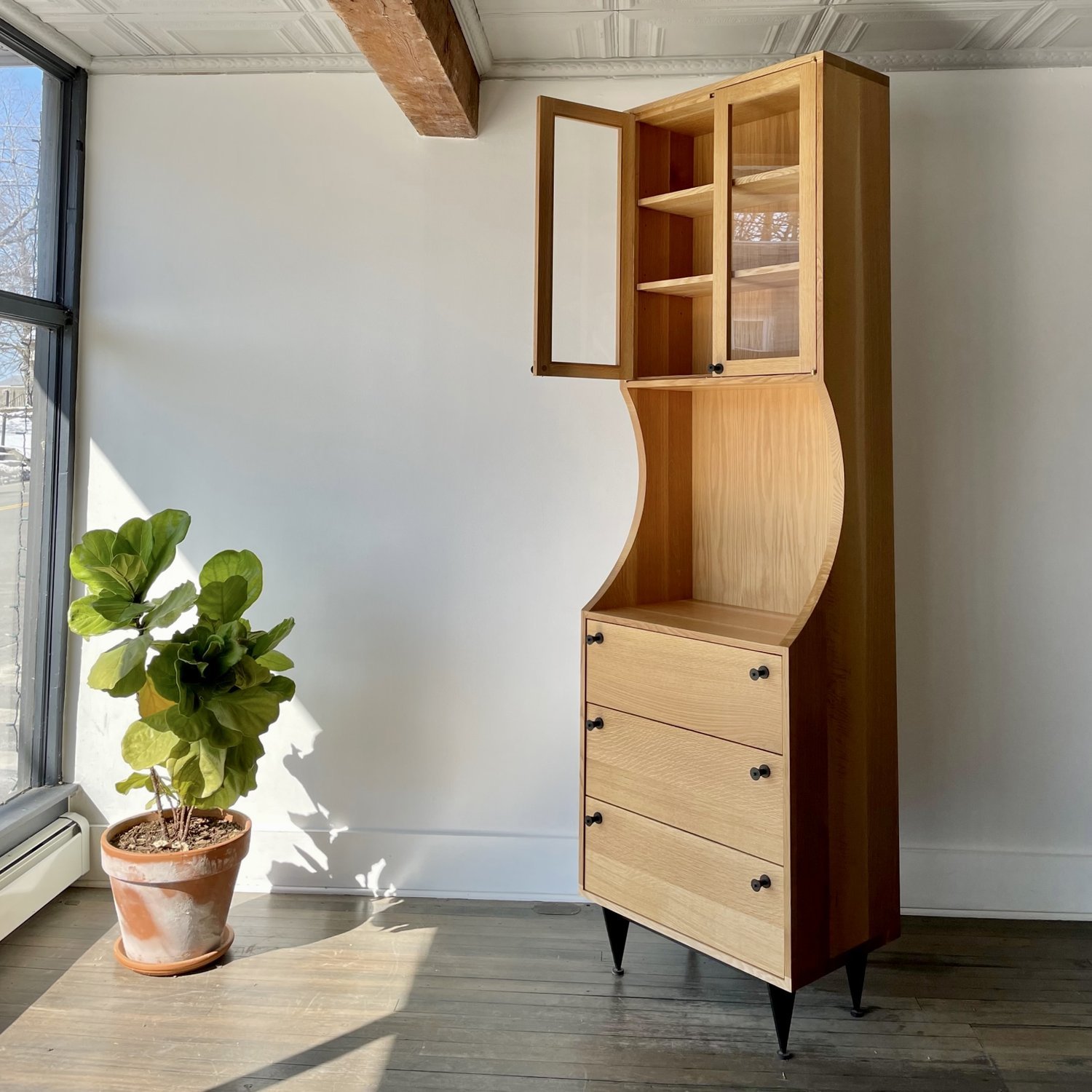 Finish: Oiled White Oak, Ebonized Cherry Bobbin Pulls, Blackened Steel Base