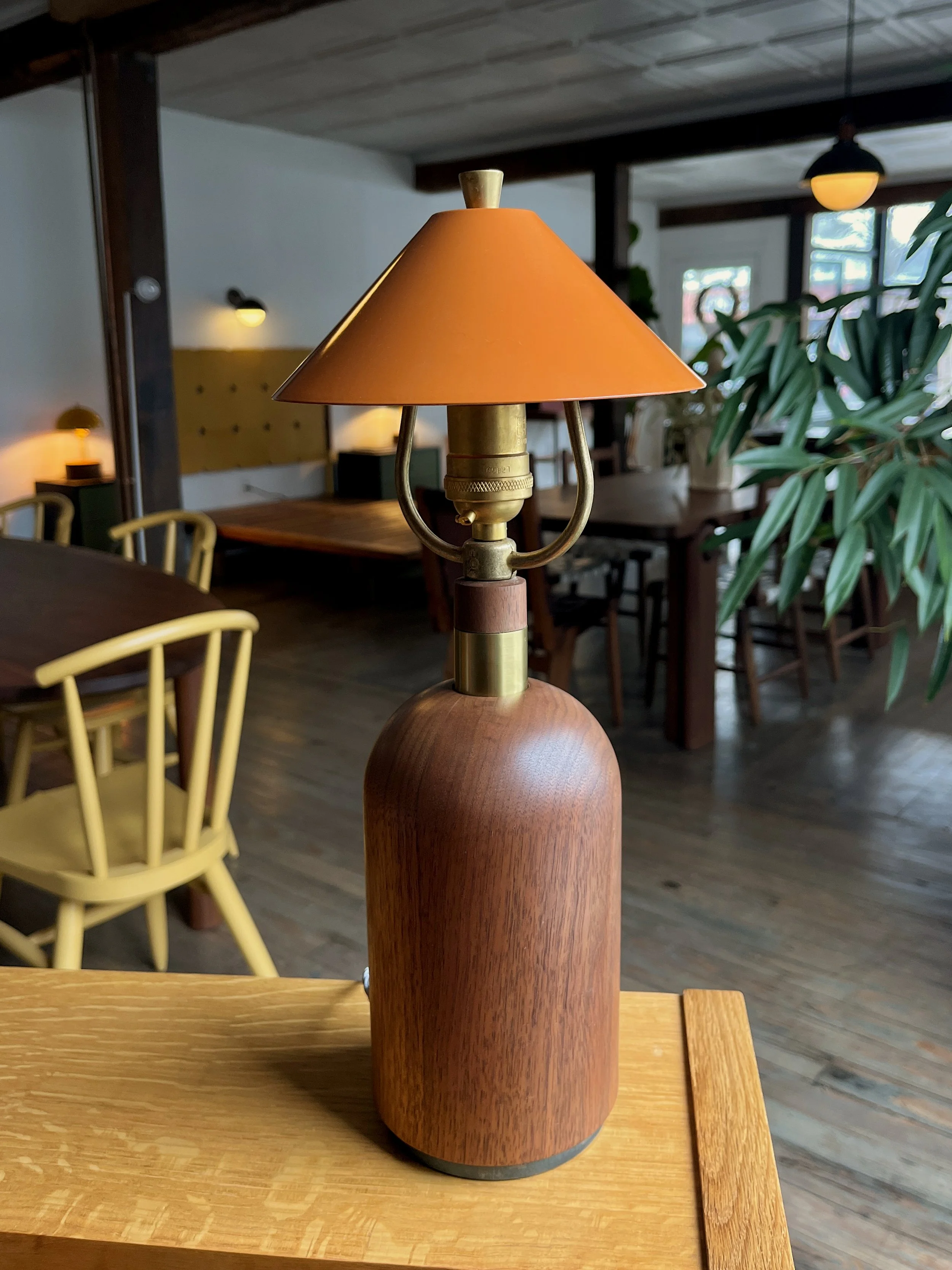 Dimensions: 16 1/2” OH, 4” Dia Oiled Walnut Base, 7” Dia Cone Shade in Rust