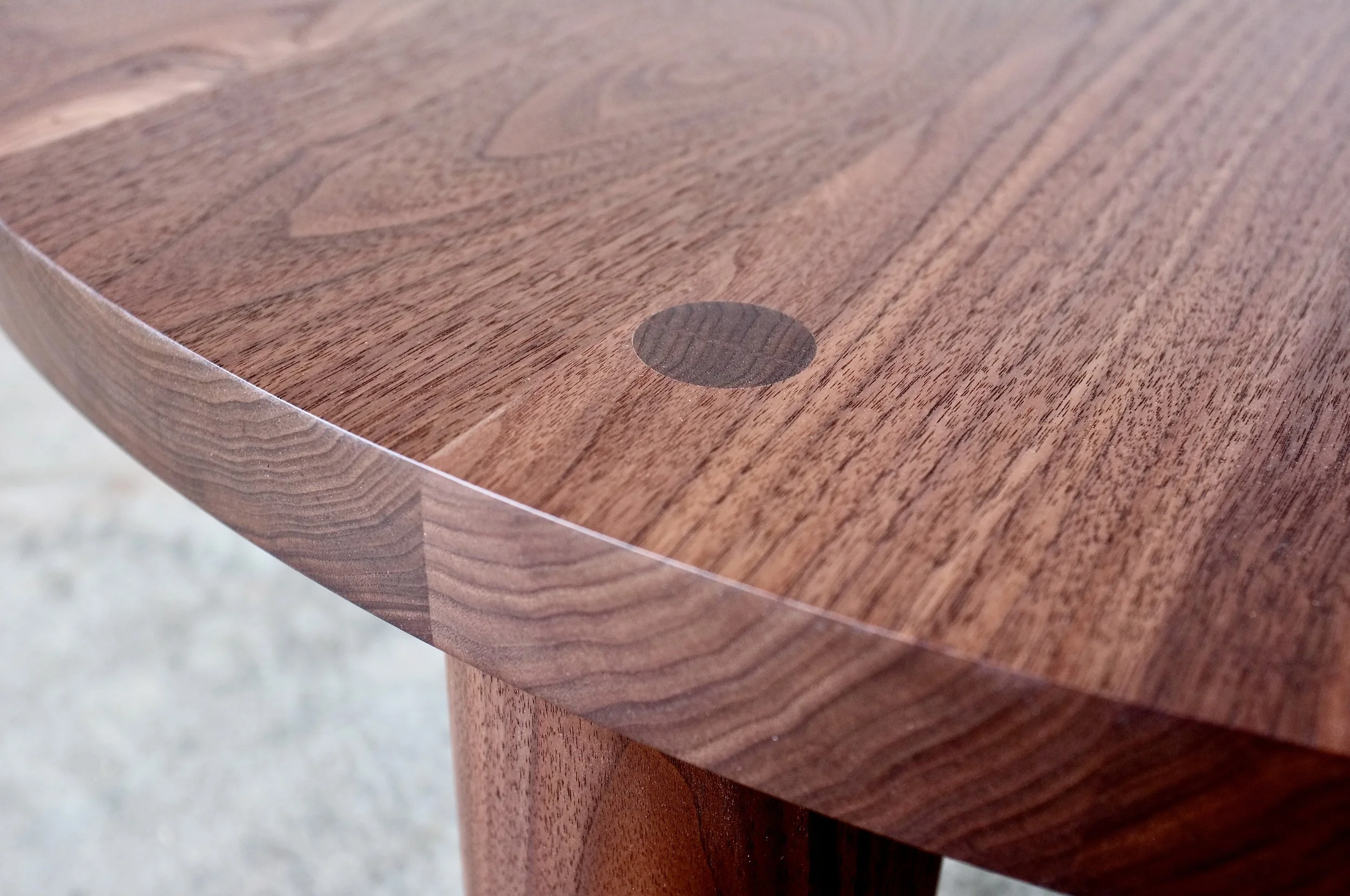 Minimal in form, the Solo Coffee Table utilizes three torpedo-shaped solid wood legs traditionally joined into a robust solid wood top. The wedged-through tenons visible from the top keep this table's construction transparent while encouraging the hand to touch. Available in diameters up to 72".