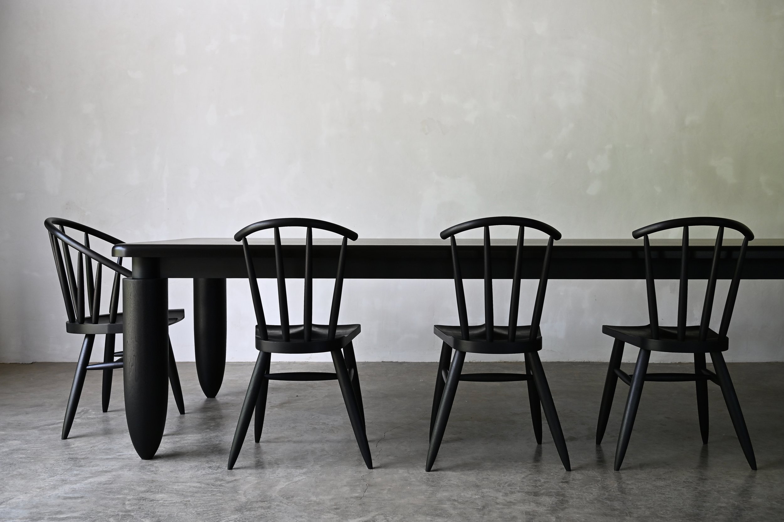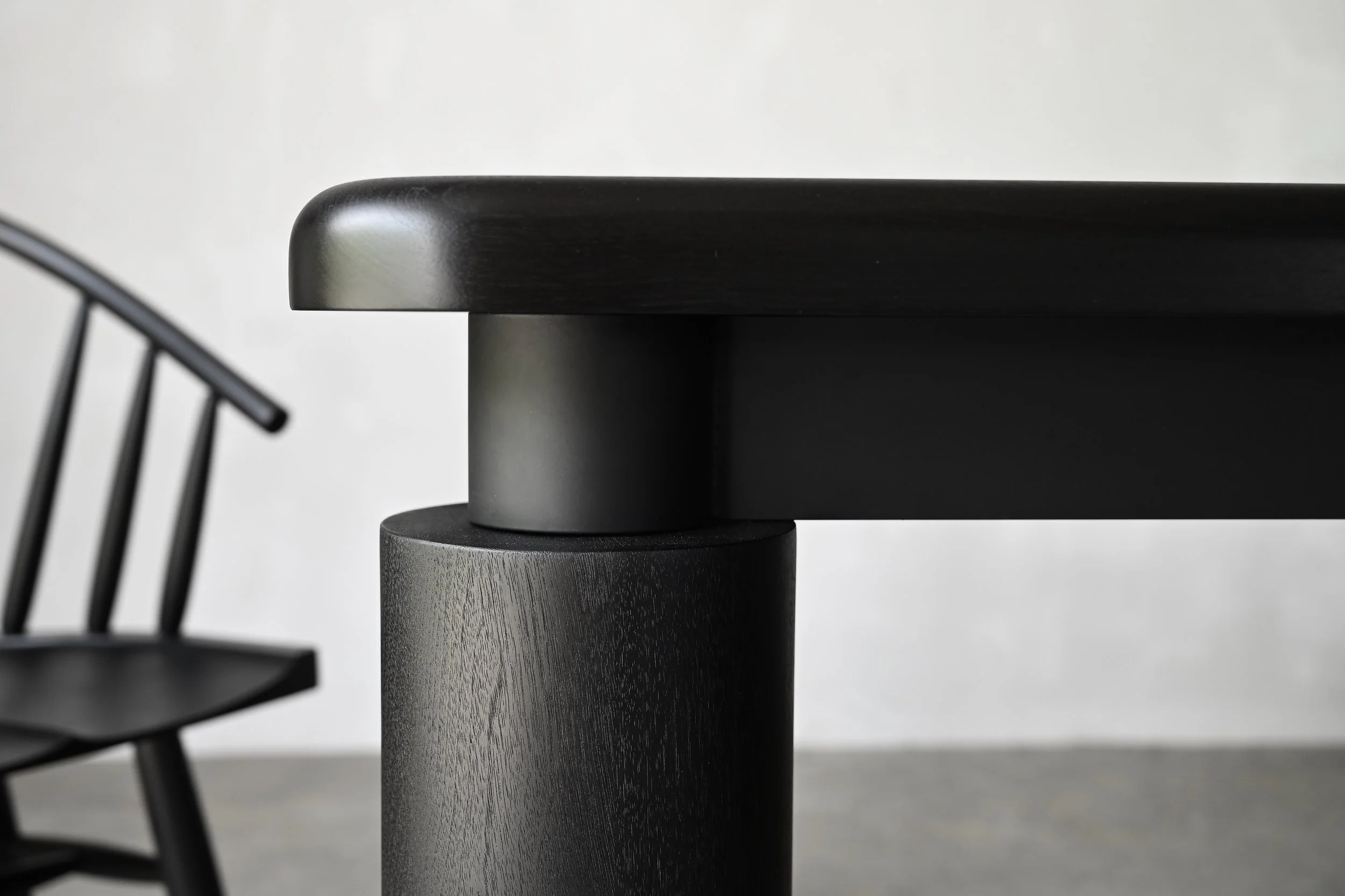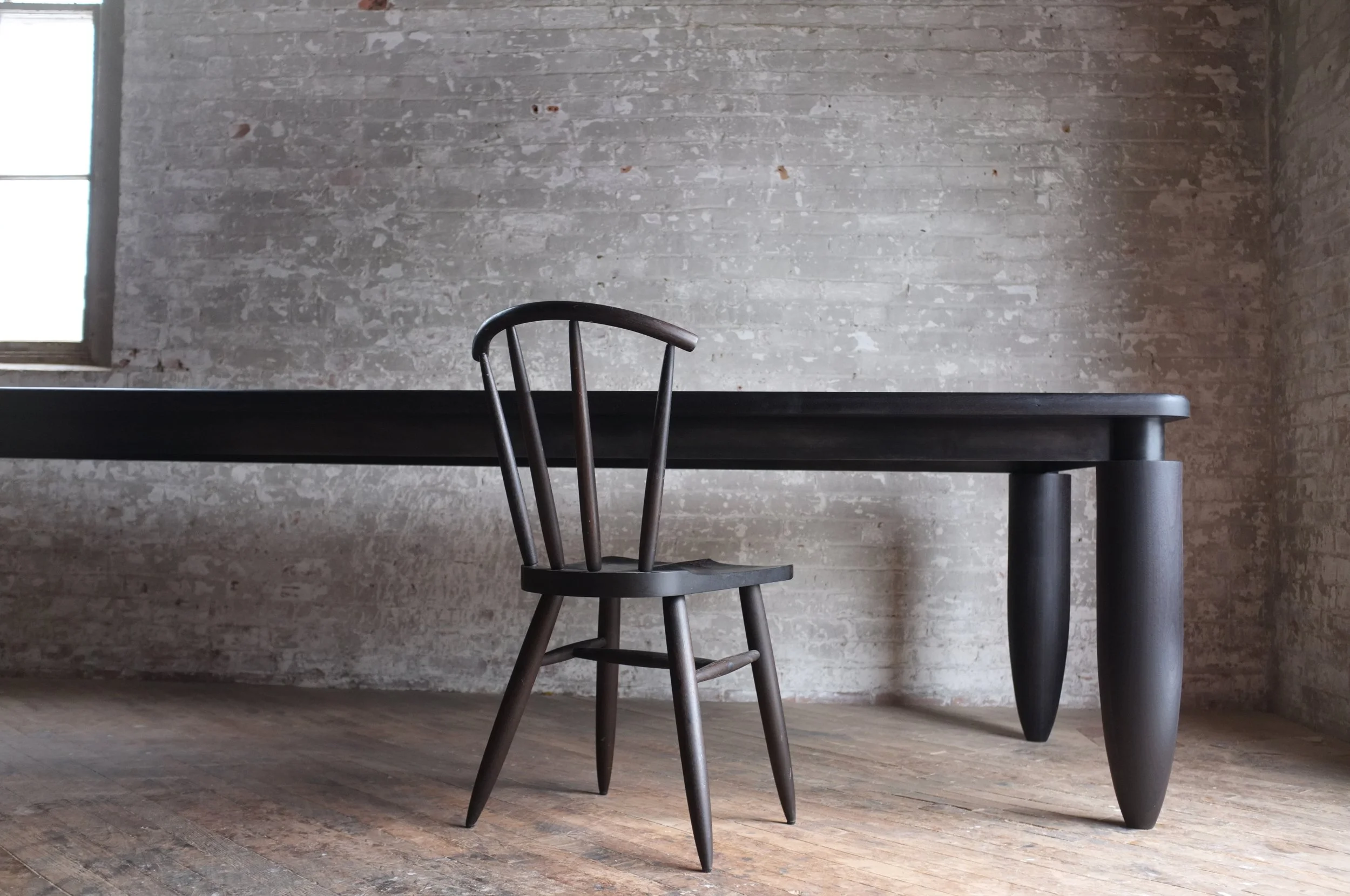 A substantial solid wood dining table with torpedo-shaped legs and a blackened steel apron.