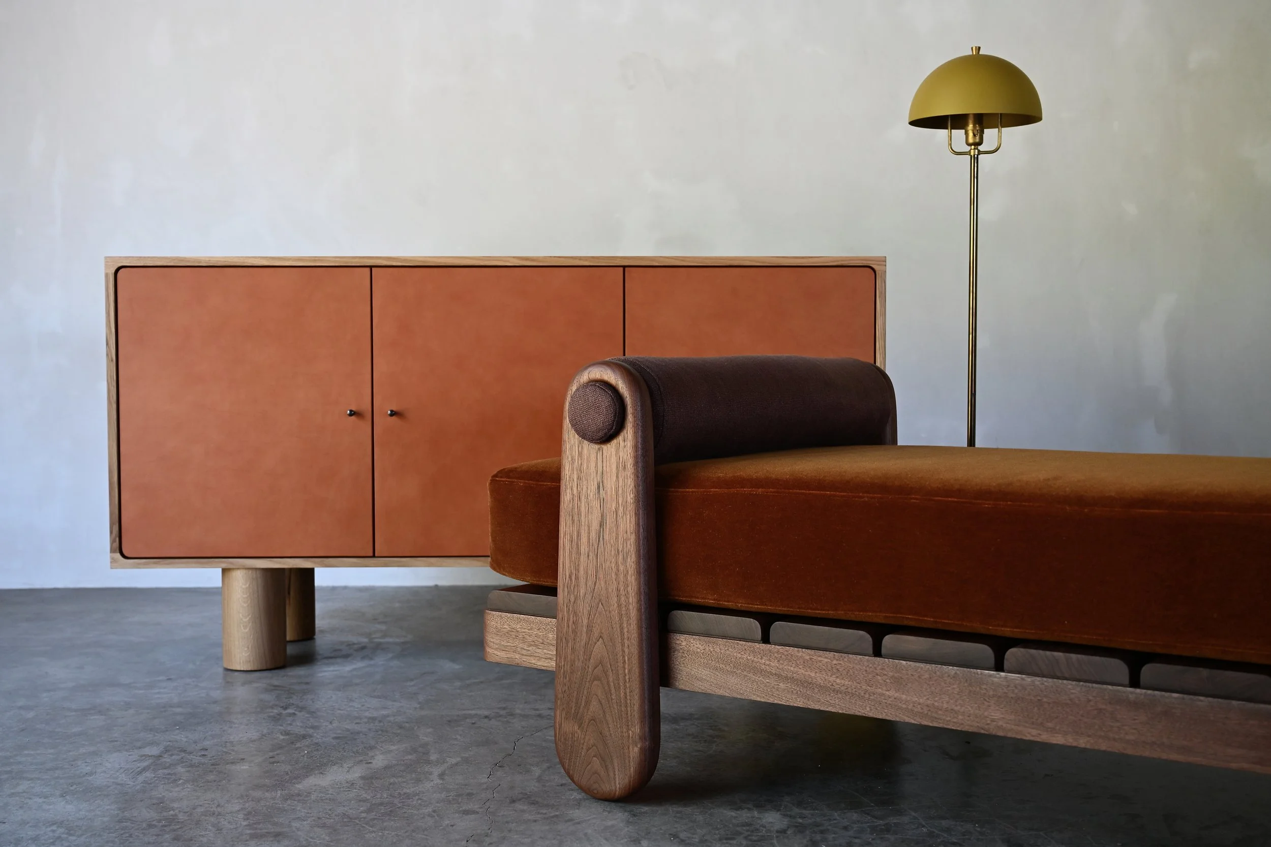 A poof of upholstery becomes fully integrated into the sculptural wooden frame, mimicking a traditional wooden joint.