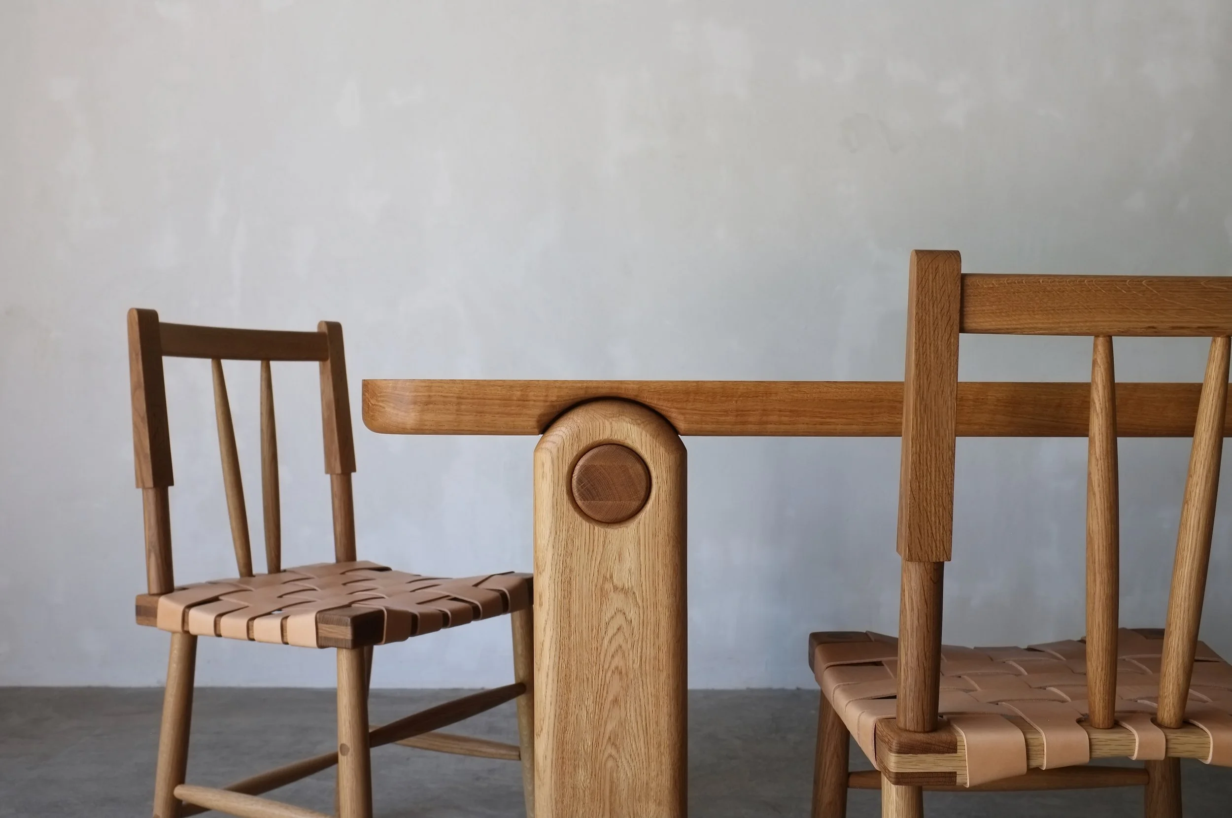 A softened solid wood table top keyways into arched leg structures, harmonizing with a circular end grain feature. Available in Round, Square, or Rectangular formats, in lengths up to 16'.